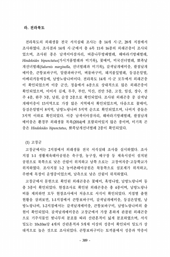 389 라. 전라북도 전라북도의 외래생물 전국 서식실태 조사는 총 14개 시·군, 28개 지점에서 조사하였다. 조사결과 14개 시·군에서 총 6목 11과 16종의 외래곤충이 조사되 었으며, 조사된 종은 남색이마잠자리, 버즘나무방패벌레, 해바라기방패벌레, Hindoloides bipunctatus 가시거품벌레과 미기록 , 꽃매미, 미국선녀벌레, 뾰족날 개선녀벌레 Salurnis marginella, 선녀벌레과 미기록 , 갈색날개매미충, 팔점날개 매미충, 큰뚱보바구미, 알팔파바구미, 벼물바구미, 돼지풀잎벌레, 등검은말벌, 아메리카동애등에, 남방노랑나비이다. 전라북도 14개 시·군 모두에서 외래곤충 이 확인되었으며 이중 군산, 정읍에서 6종으로 상대적으로 많은 외래곤충이 확인되었으며, 이어서 김제, 무주, 부안,...
