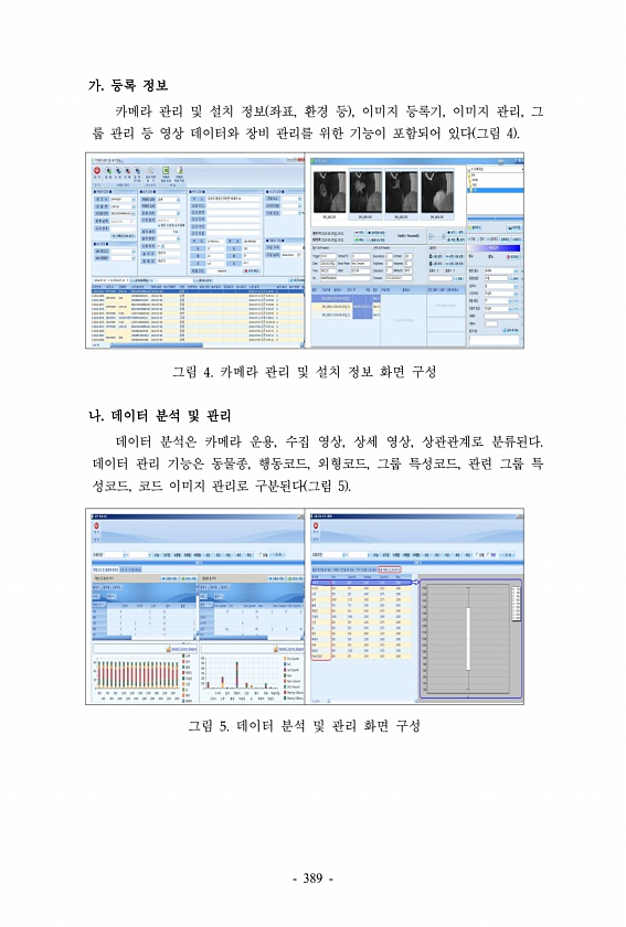 그림 4. 카메라 관리 및 설치 정보 화면 구성 가. 등록 정보 카메라 관리 및 설치 정보 좌표, 환경 등 , 이미지 등록기, 이미지 관리, 그 룹 관리 등 영상 데이터와 장비 관리를 위한 기능이 포함되어 있다 그림 4 나. 데이터 분석 및 관리 데이터 분석은 카메라 운용, 수집 영상, 상세 영상, 상관관계로 분류된다. 데이터 관리 기능은 동물종, 행동코드, 외형코드, 그룹 특성코드, 관련 그룹 특 성코드, 코드 이미지 관리로 구분된다 그림 5 그림 5. 데이터 분석 및 관리 화면 구성 389