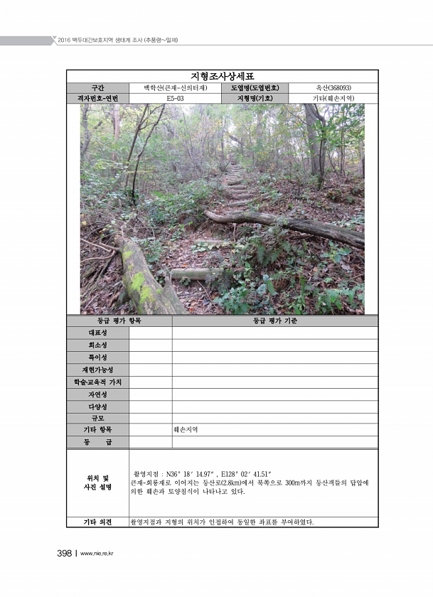 2016 백두대간보호지역 생태계 조사 추풍령밀재 398Ⅰwww.nie.re.kr 지형조사상세표 구간 백학산 큰재-신의터재 도엽명 도엽번호 옥산 368093 격자번호-연번 E5-03 지형명 기호 기타 훼손지역 등급 평가 항목 등급 평가 기준 대표성 희소성 특이성 재현가능성 학술?교육적 가치 자연성 다양성 규모 기타 항목 훼손지역 등 급 위치 및 사진 설명 촬영지점 N36° 18′ 14.97″ , E128° 02′ 41.51″ 큰재-회룡재로 이어지는 등산로 2.8km 에서 북쪽으로 300m까지 등산객들의 답압에 의한 훼손과 토양침식이 나타나고 있다. 기타 의견 촬영지점과 지형의 위치가 인접하여 동일한 좌표를부여하였다.