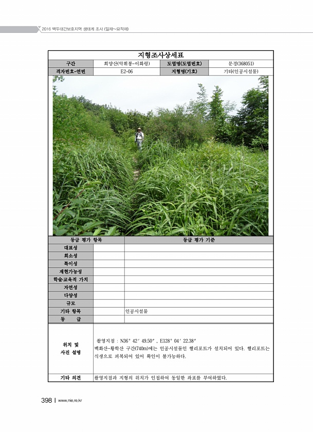 2016 백두대간보호지역 생태계 조사 밀재묘적재 398Ⅰwww.nie.re.kr 지형조사상세표 구간 희양산 악휘봉-이화령 도엽명 도엽번호 문경 368051 격자번호-연번 E2-06 지형명 기호 기타 인공시설물 등급 평가 항목 등급 평가 기준 대표성 희소성 특이성 재현가능성 학술?교육적 가치 자연성 다양성 규모 기타 항목 인공시설물 등 급 위치 및 사진 설명 촬영지점 N36° 42′ 49.50″ , E128° 04′ 22.38″ 백화산황학산 구간 740m 에는 인공시설물인 헬리포트가 설치되어 있다. 헬리포트는 식생으로 피복되어 있어 확인이 불가능하다. 기타 의견 촬영지점과 지형의 위치가 인접하여 동일한 좌표를부여하였다.