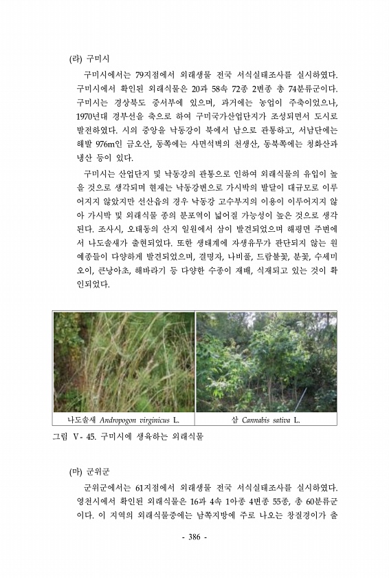 라 구미시 구미시에서는 79지점에서 외래생물 전국 서식실태조사를 실시하였다. 구미시에서 확인된 외래식물은 20과 58속 72종 2변종 총 74분류군이다. 구미시는 경상북도 중서부에 있으며, 과거에는 농업이 주축이었으나, 1970년대 경부선을 축으로 하여 구미국가산업단지가 조성되면서 도시로 발전하였다. 시의 중앙을 낙동강이 북에서 남으로 관통하고, 서남단에는 해발 976m인 금오산, 동쪽에는 사면석벽의 천생산, 동북쪽에는 청화산과 냉산 등이 있다. 구미시는 산업단지 및 낙동강의 관통으로 인하여 외래식물의 유입이 높 을 것으로 생각되며 현재는 낙동강변으로 가시박의 발달이 대규모로 이루 어지지 않았지만 선산읍의 경우 낙동강 고수부지의 이용이 이루어지지 않 아 가시박 및 외래식물 종의 분포역이 넓어질 가능성이 높은...