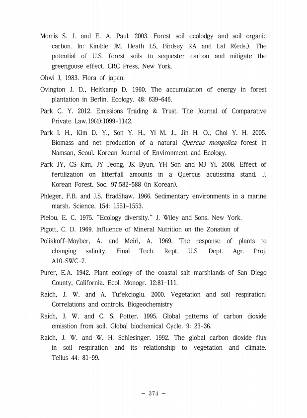 374 Morris S. J. and E. A. Paul. 2003. Forest soil ecolodgy and soil organic carbon. InKimble JM, Heath LS, Birdsey RA and Lal R eds, The potential of U.S. forest soils to sequester carbon and mitigate the greengouse effect. CRC Press, New York. Ohwi J, 1983. Flora of japan. Ovington J. D., Heitkamp D. 1960. The accumulation of energy in forest plantation in Berlin. Ecology. 48639-646. Park C. Y. ...