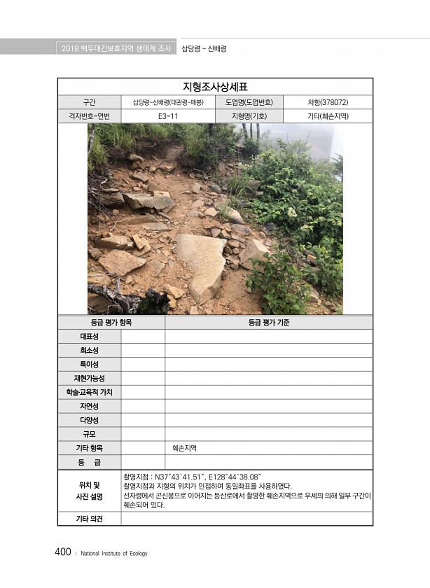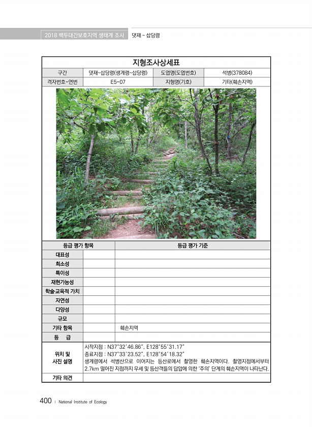 2018 백두대간보호지역 생태계 조사 삽당령 신배령 400 ? National Institute of Ecology 지형조사상세표 구간 삽당령신배령 대관령매봉 도엽명 도엽번호 차항 378072 격자번호-연번 E3-11 지형명 기호 기타 훼손지역 등급 평가 항목 등급 평가 기준 대표성 희소성 특이성 재현가능성 학술?교육적 가치 자연성 다양성 규모 기타 항목 훼손지역 등 급 위치 및 사진 설명 촬영지점 N37°43′41.51″, E128°44′38.08″ 촬영지점과 지형의 위치가 인접하여 동일좌표를 사용하였다. 선자령에서 곤신봉으로 이어지는 등산로에서 촬영한 훼손지역으로 우세의 의해 일부 구간이 훼손되어 있다. 기타의견