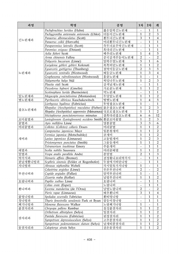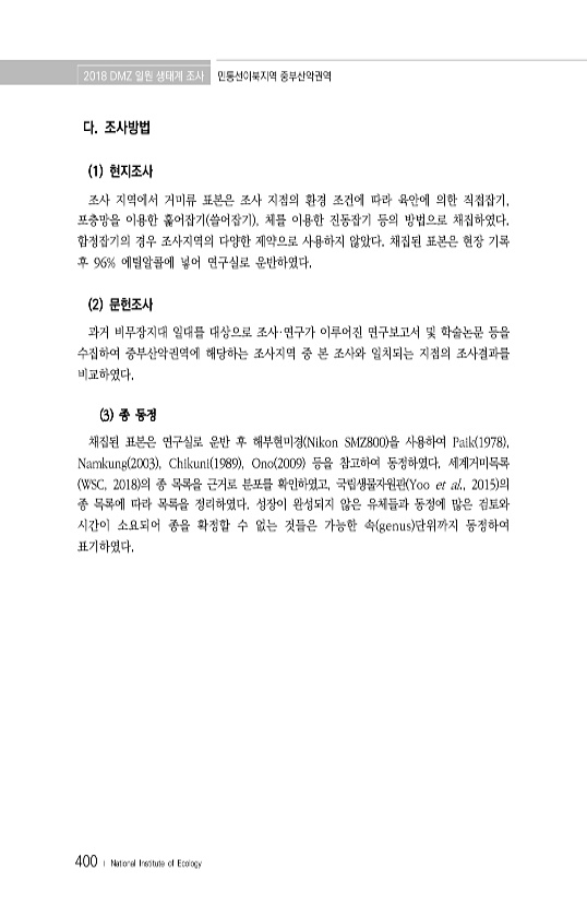 2018 DMZ 일원 생태계 조사 민통선이북지역 중부산악권역 400 ? National Institute of Ecology 다. 조사방법 1 현지조사 조사 지역에서 거미류 표본은 조사 지점의 환경 조건에 따라 육안에 의한 직접잡기, 포충망을 이용한 훑어잡기 쓸어잡기 , 체를 이용한 진동잡기 등의 방법으로 채집하였다. 함정잡기의 경우 조사지역의 다양한 제약으로 사용하지 않았다. 채집된 표본은 현장 기록 후 96% 에틸알콜에 넣어 연구실로 운반하였다. 2 문헌조사 과거 비무장지대 일대를 대상으로 조사·연구가 이루어진 연구보고서 및 학술논문 등을 수집하여 중부산악권역에 해당하는 조사지역 중 본 조사와 일치되는 지점의 조사결과를 비교하였다. 3 종 동정 채집된 표본은 연구실로 운반 후 해부현미경 Nikon SMZ...
