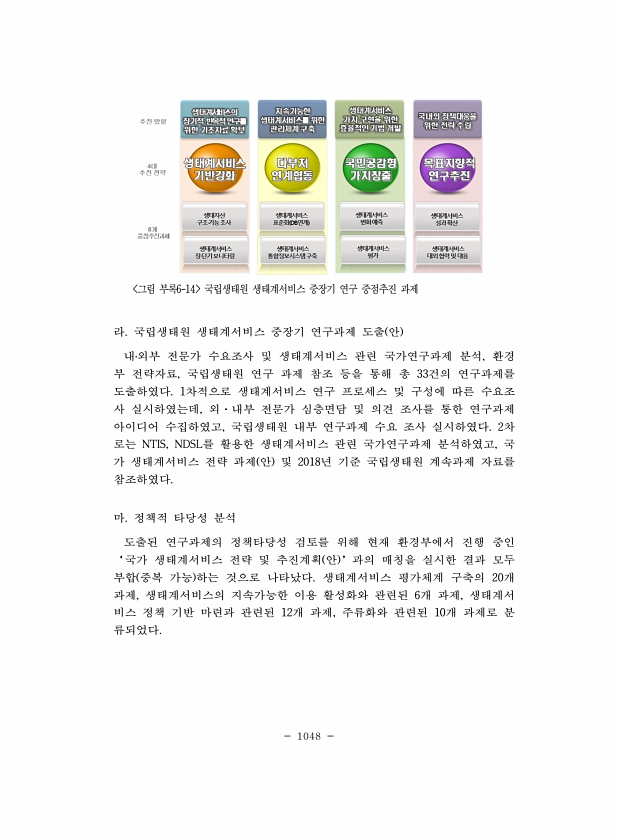 1048 그림 부록6-14 국립생태원 생태계서비스 중장기 연구 중점추진 과제 라. 국립생태원 생태계서비스 중장기 연구과제 도출 안 내?외부 전문가 수요조사 및 생태계서비스 관련 국가연구과제 분석, 환경 부 전략자료, 국립생태원 연구 과제 참조 등을 통해 총 33건의 연구과제를 도출하였다. 1차적으로 생태계서비스 연구 프로세스 및 구성에 따른 수요조 사 실시하였는데, 외·내부 전문가 심층면담 및 의견 조사를 통한 연구과제 아이디어 수집하였고, 국립생태원 내부 연구과제 수요 조사 실시하였다. 2차 로는 NTIS, NDSL를 활용한 생태계서비스 관련 국가연구과제 분석하였고, 국 가 생태계서비스 전략 과제 안 및 2018년 기준 국립생태원 계속과제 자료를 참조하였다. 마. 정책적 타당성 분석 도출된 연구과제의 정책...