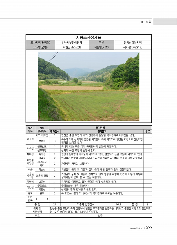 Ⅲ. 부록 www.nie.re.kr ? 399 지형조사상세표 조사지역 권역명 17-서부평야권역 구분 민통선이북지역 코스명 연번 덕현골코스 03 지형명 기호 곡저평야 GS12 평가 항목 세부 평가항목 평가방법 평가점수 평가근거 비 고 대표성 지역 대표성 1 연천군 중면 도연리 곡의 상류부에 발달한 곡저평야로 대표성은 낮다. 전형성 3 유수에 의해 산지에서 공급된 퇴적물이 곡에 퇴적되어 형성된 지형으로 전형적인 형태를 보이고 있다. 희소성 분포빈도 1 국내의 대소 곡을 따라 곡저평야의 발달이 탁월하다. 분포패턴 1 산지의 하천 주변에 발달해 있다. 특이성 특이성 2 원생대 천매암의 퇴적물이 퇴적되어 있어, 편평도가 높은 역들이 퇴적되어 있다. 재현불 가능성 민감성 2 인위적인 변형이 이루어지더라고 시간이 지나면...