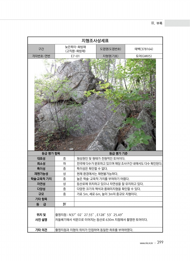 Ⅲ. 부록 www.nie.re.kr ? 399 지형조사상세표 구간 늦은목이화방재 고직령-화방재 도엽명 도엽번호 태백 378164 격자번호-연번 E7-01 지형명 기호 토어 GM05 등급 평가 항목 등급 평가 기준 대표성 중 형성원인 및 형태가 전형적인 토어이다. 희소성 하 전국에 다수가 분포하고 있으며 해당 조사구간 내에서도 다수 확인된다. 특이성 중 특이성은 확인할 수 없다. 재현가능성 상 현재 환경에서는 재현불가능하다. 학술?교육적 가치 중 높은 학술·교육적 가치를 부여하기 어렵다. 자연성 상 등산로에 위치하고 있으나 자연성을 잘 유지하고 있다. 다양성 중 다양한 크기의 핵석과 풍화미지형을 확인할 수 있다. 규모 중 가로 5m, 세로 6m, 높이 3m의 중규모 지형이다. 기타 항목 등 급 Ⅳ 위치 및 사...