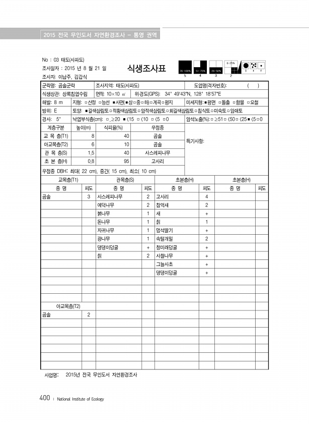 2015 전국 무인도서 자연환경조사 통영 권역 400 ? National Institute of Ecology No 03 태도 사파도 조사일자 2015 년 8 월 21 일 조사자이남주, 김갑식 식생조사표 군락명곰솔군락 조사지역태도 사파도 도엽명 격자번호 식생상관상록침엽수림 면적10×10 ㎡ 위?경도 GPS 34°4943N, 128°1857E 해발8 m 지형□산정 □능선 ■사면 ■상□중□하 □계곡□평지 미세지형■평면 □돌출 □함몰 □요철 방위E 토양■갈색삼림토□적황색삼림토□암적색삼림토□회갈색삼림토□침식토□미숙토□암쇄토 경사5° 낙엽부식층 cm □.≥20 ■ 15 □ 10 □ 5 □0 암석노출 % □≥51□ 50□ 25■ 5□0 계층구분 높이 m 식피율 % 우점종 특기사항교 목 층 T1 8 40 곰솔 아교목층 ...