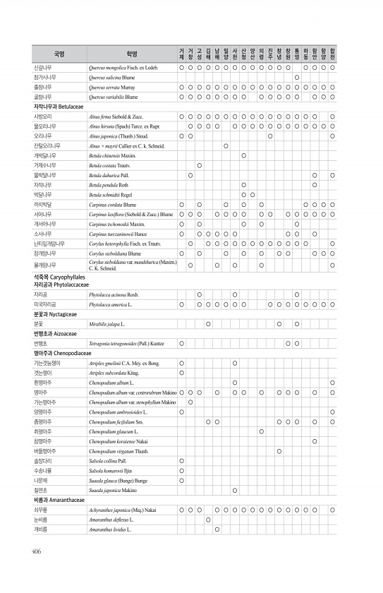406 신갈나무 Quercus mongolica Fisch. ex Ledeb. ○ ○ ○ ○ ○ ○ ○ ○ ○ ○ ○ ○ ○ ○ ○ ○ ○ 참가시나무 Quercus salicina Blume ○ 졸참나무 Quercus serrata Murray ○ ○ ○ ○ ○ ○ ○ ○ ○ ○ ○ ○ ○ ○ ○ ○ ○ ○ 굴참나무 Quercus variabilis Blume ○ ○ ○ ○ ○ ○ ○ ○ ○ ○ ○ ○ ○ ○ ○ ○ 자작나무과 Betulaceae 사방오리 Alnus frma Siebold & Zucc. ○ ○ ○ ○ ○ ○ ○ ○ ○ ○ ○ ○ ○ ○ ○ ○ ○ 물오리나무 Alnus hirsuta Spach Turcz. ex Rupr. ○ ○ ○ ○ ○ ○ ○ ○ ○ ○ ○ ○ ○ ○ ○ ○ 오리나무 Aln...