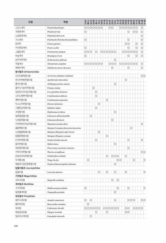 408 스미스개미 Paratrechina favipes ○ ○ ○ ○ ○ ○ ○ ○ ○ ○ ○ ○ ○ ○ ○ ○ ○ 극동혹개미 Pheidole fervida ○ ○ ○ ○ ○ 노랑잘록개미 Plagiolepis favescens ○ 가시개미 Polyrhachis Polyrhachis lamellidens ○ ○ ○ 침개미 Ponera japonica ○ ○ ○ ○ 거치른침개미 Ponera scabra ○ ○ ○ ○ 그물등개미 Pristomyrmex pungens ○ ○ ○ ○ ○ ○ ○ ○ ○ ○ ○ ○ ○ ○ ○ ○ ○ 비늘개미 Strumigenys lewisi ○ ○ ○ ○ 납작자루개미 Technomyrmex gibbosus ○ 주름개미 Tetramorium caespitum ○ ○ ○ ○ ○ ○ ○ ○ ...