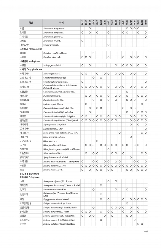 407 비름 Amaranthus mangostanus L. ○ ○ ○ ○ ○ 털비름 Amaranthus retrofexus L. ○ ○ ○ ○ ○ ○ ○ ○ 가시비름 Amaranthus spinosus L. ○ 청비름 Amaranthus viridis L. ○ 개맨드라미 Celosia argentea L. ○ 쇠비름과 Portulacaceae 채송화 Portulaca grandifora Hooker ○ 쇠비름 Portulaca oleracea L. ○ ○ ○ ○ ○ ○ ○ ○ ○ 석류풀과 Mollugiceae 석류풀 Mollugo pentaphylla L. ○ ○ ○ ○ ○ ○ ○ ○ 석죽과 Caryophyllaceae 벼룩이자리 Areria serpyllifolia L. ○ ○ ○ ○ ○ ○ ○ ○ ○ ○...