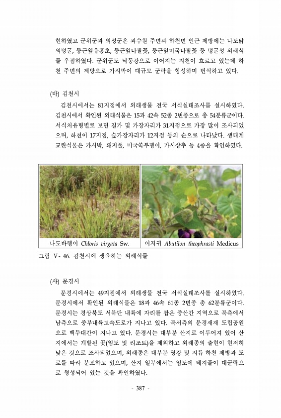 현하였고 군위군과 의성군은 과수원 주변과 하천변 인근 제방에는 나도닭 의덩굴, 둥근잎유홍초, 둥근잎나팔꽃, 둥근잎미국나팔꽃 등 덩굴성 외래식 물 우점하였다. 군위군도 낙동강으로 이어지는 지천이 흐르고 있는데 하 천 주변의 제방으로 가시박이 대규모 군락을 형성하며 번식하고 있다. 바 김천시 김천시에서는 81지점에서 외래생물 전국 서식실태조사를 실시하였다. 김천시에서 확인된 외래식물은 15과 42속 52종 2변종으로 총 54분류군이다. 서식처유형별로 보면 길가 및 가장자리가 31지점으로 가장 많이 조사되었 으며, 하천이 17지점, 숲가장자리가 12지점 등의 순으로 나타났다. 생태계 교란식물은 가시박, 돼지풀, 미국쑥부쟁이, 가시상추 등 4종을 확인하였다. 나도바랭이 Chloris virgata Sw. 어저귀 A...