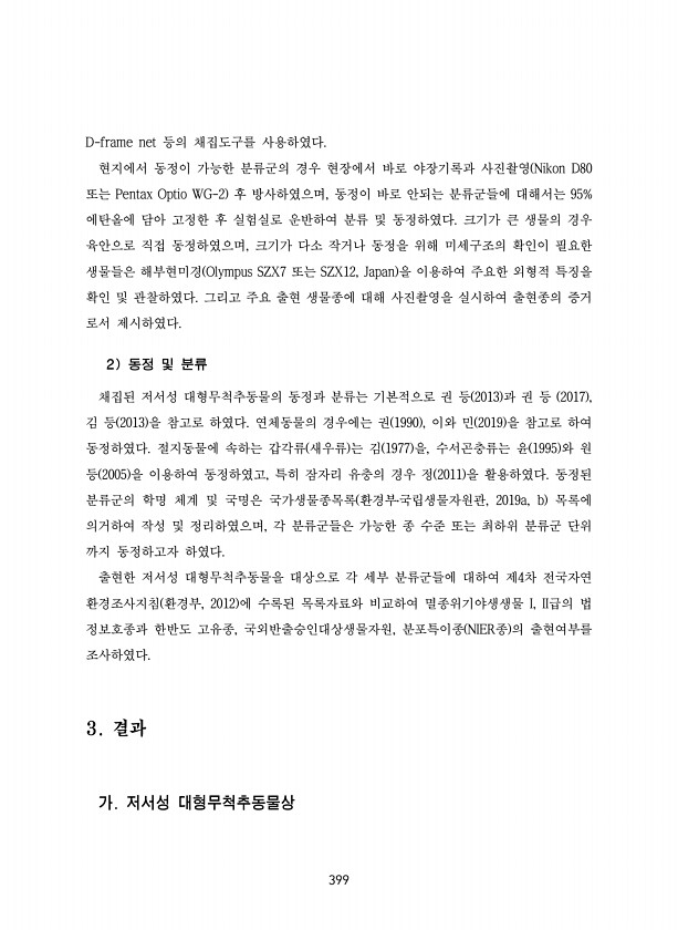 399 D-frame net 등의 채집도구를 사용하였다. 현지에서 동정이 가능한 분류군의 경우 현장에서 바로 야장기록과 사진촬영 Nikon D80 또는 Pentax Optio WG-2 후 방사하였으며, 동정이 바로 안되는 분류군들에 대해서는 95% 에탄올에 담아 고정한 후 실험실로 운반하여 분류 및 동정하였다. 크기가 큰 생물의 경우 육안으로 직접 동정하였으며, 크기가 다소 작거나 동정을 위해 미세구조의 확인이 필요한 생물들은 해부현미경 Olympus SZX7 또는 SZX12, Japan 을 이용하여 주요한 외형적 특징을 확인 및 관찰하였다. 그리고 주요 출현 생물종에 대해 사진촬영을 실시하여 출현종의 증거 로서 제시하였다. 2 동정 및 분류 채집된 저서성 대형무척추동물의 동정과 분류는 기본적으로 권 등 2...