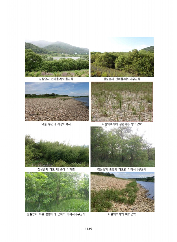 1149 침실습지 선버들-왕버들군락 침실습지 선버들-버드나무군락 여울 부근의 자갈퇴적지 자갈퇴적지에 침입하는 망초군락 침실습지 하도 내 솜대 식재림 침실습지 중류의 하도변 아까시나무군락 침실습지 하류 뿅뿅다리 근처의 아까시나무군락 자갈퇴적지의여뀌군락
