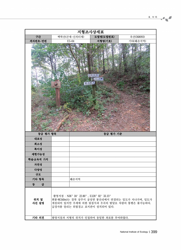 Ⅲ. 부 록 National Institute of EcologyⅠ399 지형조사상세표 구간 백학산 큰재-신의터재 도엽명 도엽번호 옥산 368093 격자번호-연번 E5-04 지형명 기호 기타 훼손지역 등급 평가 항목 등급 평가 기준 대표성 희소성 특이성 재현가능성 학술?교육적 가치 자연성 다양성 규모 기타 항목 훼손지역 등 급 위치 및 사진 설명 촬영지점 N36° 18′ 22.86″ , E128° 02′ 33.15″ 회룡재 340m 는 경북 상주시 공성면 봉산리에서 연결되는 임도가 지나가며, 임도가 개설되어 있지만 우세에 의한 릴침식과 우곡의 발달로 차량의 통행은 불가능하다. 급경사를 알리는 위험경고 표지판이 설치되어 있다. 기타 의견 촬영지점과 지형의 위치가 인접하여 동일한 좌표를부여하였다.