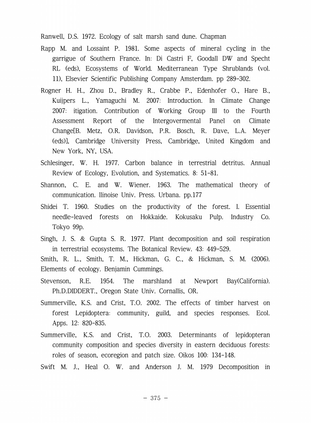 375 Ranwell, D.S. 1972. Ecology of salt marsh sand dune. Chapman Rapp M. and Lossaint P. 1981. Some aspects of mineral cycling in the garrigue of Southern France. InDi Castri F, Goodall DW and Specht RL eds , Ecosystems of World. Mediterranean Type Shrublands vol. 11 , Elsevier Scientific Publishing Company Amsterdam. pp 289-302. Rogner H. H., Zhou D., Bradley R., Crabbe P., Edenhofer O., Hare B.,...