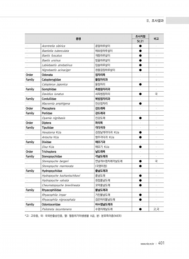 Ⅱ. 조사결과 www.nie.re.kr ? 401 종명 조사지점 비고 St.21 Acentrella sibirica 콩알하루살이 ● Baetiella tuberculata 애호랑하루살이 ● Baetis fuscatus 개똥하루살이 ● Baetis ursinus 방울하루살이 ● Labiobaetis atrebatinus 입술하루살이 ● Nigrobaetis acinaciger 흰줄깜장하루살이 ● Order Odonata 잠자리목 Family Calopterygidae 물잠자리과 Calopteryx japonica 물잠자리 ● Family Gomphidae 측범잠자리과 Davidius lunatus 쇠측범잠자리 ● 국 Family Corduliidae 북방잠자리과 ...