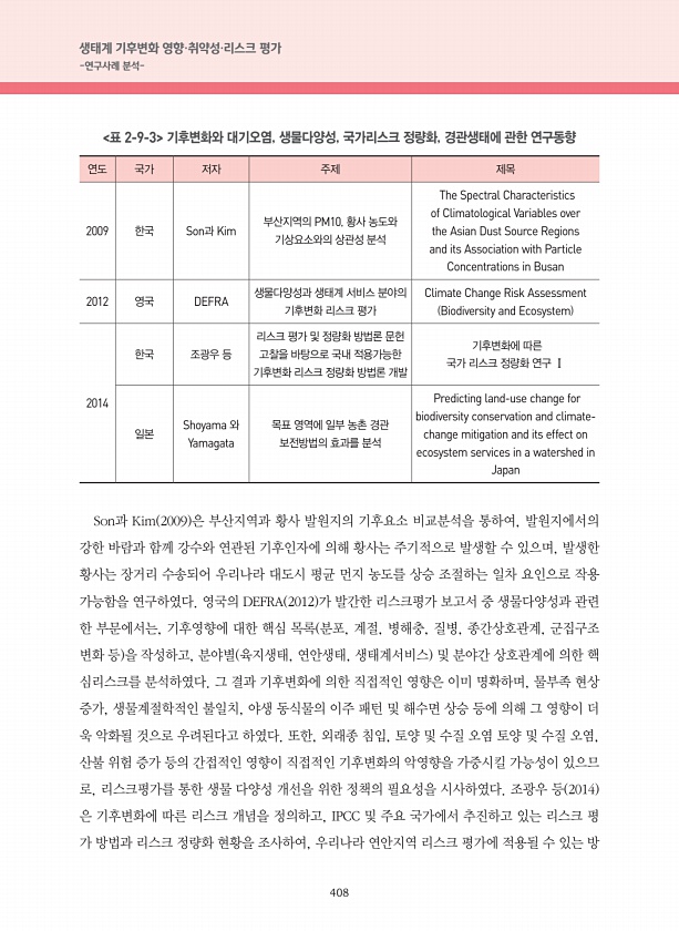 408 생태계 기후변화 영향·취약성·리스크 평가 -연구사례 분석- 표 2-9-3 기후변화와 대기오염, 생물다양성, 국가리스크 정량화, 경관생태에 관한 연구동향 연도 국가 저자 주제 제목 2009 한국 Son과 Kim 부산지역의 PM10, 황사 농도와 기상요소와의 상관성 분석 The Spectral Characteristics of Climatological Variables over the Asian Dust Source Regions and its Association with Particle Concentrations in Busan 2012 영국 DEFRA 생물다양성과 생태계 서비스 분야의 기후변화 리스크 평가 Climate Change Risk Assessment Biodiversity and Eco...
