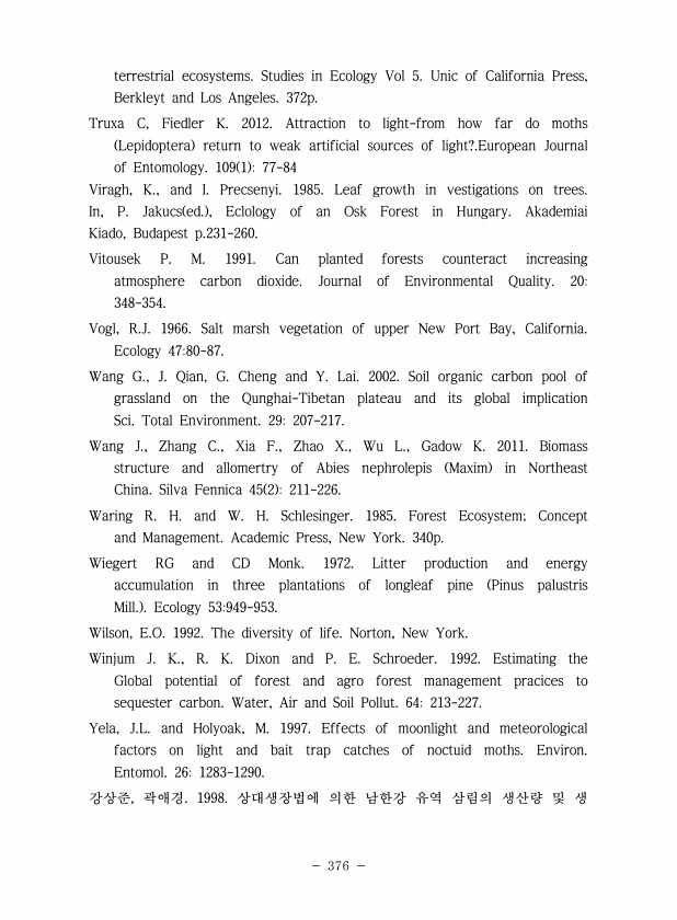 376 terrestrial ecosystems. Studies in Ecology Vol 5. Unic of California Press, Berkleyt and Los Angeles. 372p. Truxa C, Fiedler K. 2012. Attraction to light-from how far do moths Lepidoptera return to weak artificial sources of light?.European Journal of Entomology. 109 1 77-84 Viragh, K., and I. Precsenyi. 1985. Leaf growth in vestigations on trees. In, P. Jakucs ed. , Eclology of an Osk Forest ...