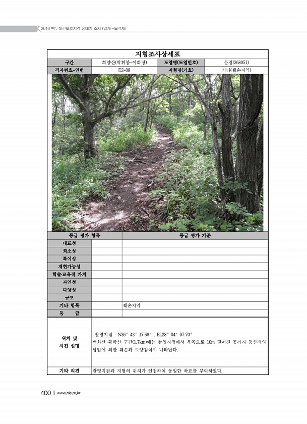 2016 백두대간보호지역 생태계 조사 밀재묘적재 400Ⅰwww.nie.re.kr 지형조사상세표 구간 희양산 악휘봉-이화령 도엽명 도엽번호 문경 368051 격자번호-연번 E2-08 지형명 기호 기타 훼손지역 등급 평가 항목 등급 평가 기준 대표성 희소성 특이성 재현가능성 학술?교육적 가치 자연성 다양성 규모 기타 항목 훼손지역 등 급 위치 및 사진 설명 촬영지점 N36° 43′ 17.68″ , E128° 04′ 07.70″ 백화산황학산 구간 1.7km 에는 촬영지점에서 북쪽으로 10m 떨어진 곳까지 등산객의 답압에 의한 훼손과 토양침식이 나타난다. 기타 의견 촬영지점과 지형의 위치가 인접하여 동일한 좌표를부여하였다.