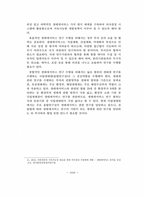 1050 뢰성 있고 과학적인 생태계서비스 가치 평가 체계를 구축하여 의사결정 시 스템에 활용함으로써 지속가능한 개발정책이 이루어 질 수 있도록 해야 한 다. 효율적인 생태계서비스 연구 수행을 위해서는 정부 부처 간의 조율 및 협 력도 중요하다. 생태계서비스는 직접재화, 간접재화, 비재화의 특성으로 인 해 지표 설정 및 평가에 어려움이 따르는데, 다양한 접근법이 가능하여 다 루기 어려우므로 국가 차원에서 연구되어야 할 분야이며, 부처간의 협력이 반드시 필요하다. 국내 연구기관과의 협의를 통해 통합 데이터 수집 및 지 속적인 업데이트가 이루어 질 수 있도록 해야 하며, 관리기관들과의 주기적 인 워크숍, 세미나, 포럼 등을 통해 의견을 나누고 조율하여 연구를 수행할 필요가 있다. 종합적인 생태계서비스 연구 수행을...