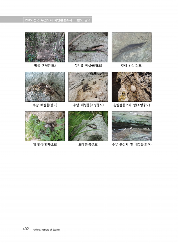 2015 전국 무인도서 자연환경조사 완도 권역 402 ? National Institute of Ecology 방목 흔적 치도 설치류 배설물 형도 칼새 번식 상도 수달 배설물 상도 수달 배설물 소병풍도 흰뺨검둥오리 알 소병풍도 매 번식 형제상도 도마뱀 복생도 수달 은신처 및 배설물 흰여