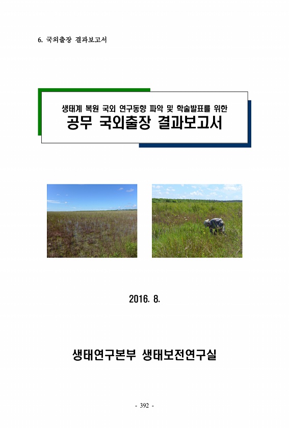 6. 국외출장 결과보고서 생태계 복원 국외 연구동향 파악 및 학술발표를 위한 공무 국외출장 결과보고서 2016. 8. 생태연구본부 생태보전연구실 392