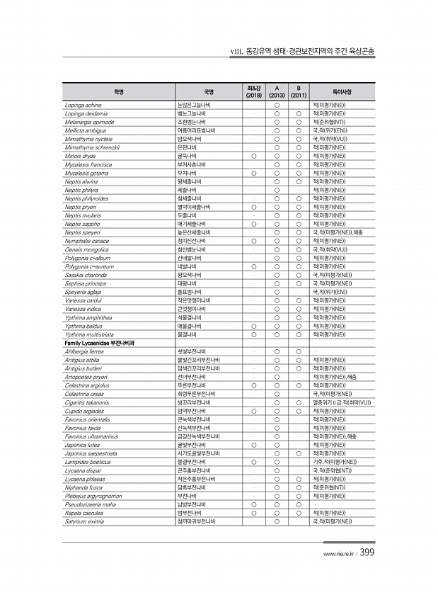 viii. 동강유역 생태·경관보전지역의 주간 육상곤충 www.nie.re.kr ?399 학명 국명 최&강 2018 A 2013 B 2011 특이사항 Lopinga achine 눈많은그늘나비 ○ 적 미평가 NE Lopinga deidamia 뱀눈그늘나비 ○ ○ 적 미평가 NE Melanargia epimede 조흰뱀눈나비 ○ ○ 적 준위협 NT Mellicta ambigua 여름어리표범나비 ○ ○ 국,적 위기 EN Mimathyma nycteis 밤오색나비 ○ ○ 국,적 취약 VU Mimathyma schrenckii 은판나비 ○ ○ 적 미평가 NE Minois dryas 굴뚝나비 ○ ○ ○ 적 미평가 NE Mycalesis francisca 부처사촌나비 ○ ○ 적 미평가 NE M...