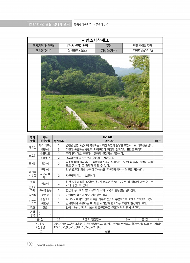 2017 DMZ 일원 생태계 조사 민통선이북지역 서부평야권역 402 ? National Institute of Ecology 지형조사상세표 조사지역 권역명 17-서부평야권역 구분 민통선이북지역 코스명 연번 덕현골코스 06 지형명 기호 포인트바 GS13 평가 항목 세부 평가항목 평가방법 평가점수 평가근거 비 고 대표성 지역 대표성 1 연천군 중면 도연리에 북류하는 소하천 우안에 발달한 포인트 바로 대표성은 낮다. 전형성 3 하천이 곡류하는 구간의 퇴적구간에 형성된 전형적인 포인트 바이다. 희소성 분포빈도 1 우리나라 대소 하천에서 흔하게 관찰되는 지형이다. 분포패턴 2 대소하천의 퇴적구간에 형성되는 지형이다. 특이성 특이성 2 유수에 의해 공급되어진 퇴적물이 유속이 느려지는 구간에 퇴적되어 형성된 지형 으로 ...