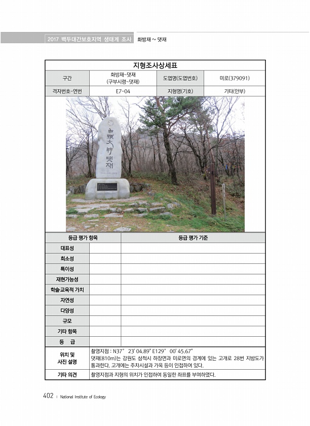 2017 백두대간보호지역 생태계 조사 화방재 댓재 402 ? National Institute of Ecology 지형조사상세표 구간 화방재댓재 구부시령댓재 도엽명 도엽번호 미로 379091 격자번호-연번 E7-04 지형명 기호 기타 안부 등급 평가 항목 등급 평가 기준 대표성 희소성 특이성 재현가능성 학술?교육적 가치 자연성 다양성 규모 기타 항목 등 급 위치 및 사진 설명 촬영지점 N37° 2304.89E129° 0045.67댓재 810m 는 강원도 삼척시 하장면과 미로면의 경계에 있는 고개로 28번 지방도가 통과한다. 고개에는 주차시설과 가옥 등이 인접하여 있다. 기타 의견 촬영지점과 지형의 위치가 인접하여 동일한 좌표를부여하였다.