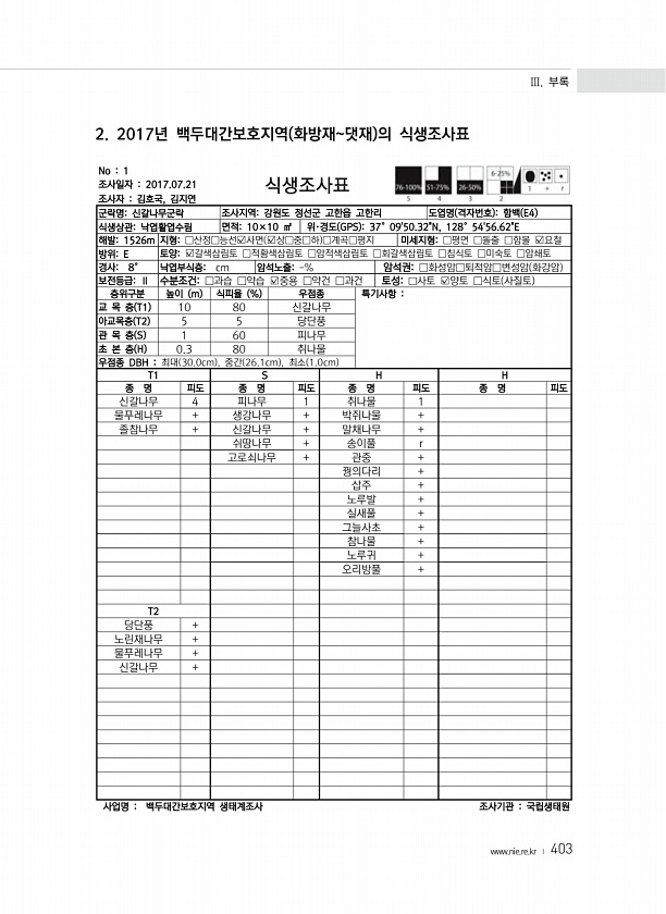 Ⅲ. 부록 www.nie.re.kr ? 403 2. 2017년 백두대간보호지역 화방재댓재 의 식생조사표 No 1 조사일자 2017.07.21 조사자 김호국, 김지연 식생조사표 군락명신갈나무군락 조사지역강원도 정선군 고한읍 고한리 도엽명 격자번호 함백 E4 식생상관낙엽활엽수림 면적10×10 ㎡ 위·경도 GPS 37°0950.32N, 128°5456.62E 해발1526m 지형□산정□능선?사면 ?상□중□하 □계곡□평지 미세지형□평면 □돌출 □함몰 ?요철 방위E 토양?갈색삼림토 □적황색삼림토 □암적색삼림토 □회갈색삼림토 □침식토 □미숙토 □암쇄토 경사8° 낙엽부식층cm 암석노출-% 암석권□화성암□퇴적암□변성암 화강암 보전등급Ⅱ 수분조건□과습 □약습 ?중용 □약건 □과건 토성□사토 ?양토 □식토 사질토 층위구분 높이...
