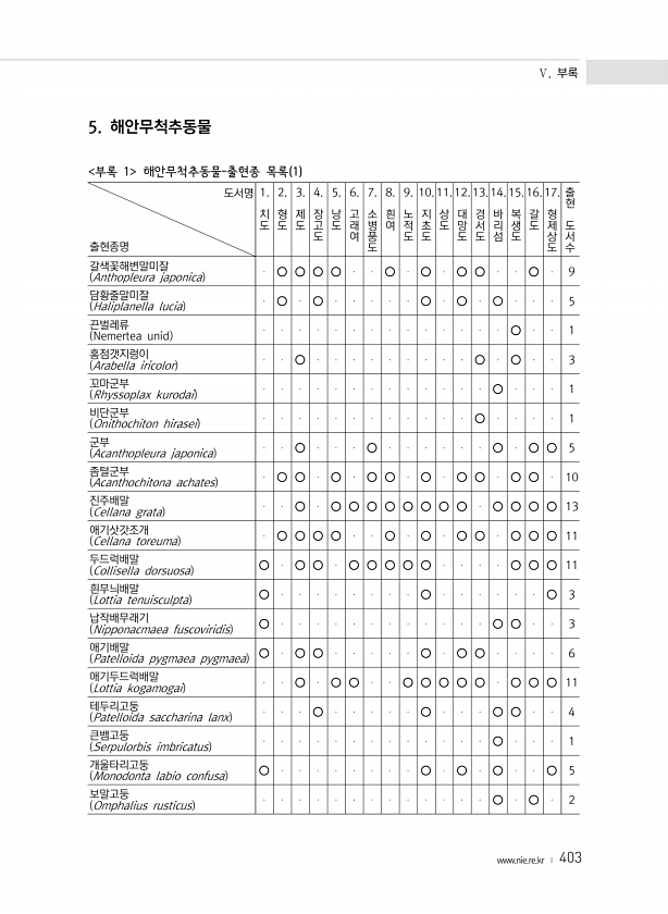 Ⅴ. 부록 www.nie.re.kr ? 403 5. 해안무척추동물 부록 1 해안무척추동물-출현종 목록 1 도서명 출현종명 1. 치도 2. 형도 3. 제도 4. 장고도 5. 낭도 6. 고래여 7. 소병풍도 8. 흰여 9. 노적도 10. 지초도 11. 상도 12. 대망도 13. 경서도 14. 바리섬 15. 복생도 16. 갈도 17. 형제상도 출현 도서수 갈색꽃해변말미잘 Anthopleura japonica ○ ○ ○ ○ ○ ○ ○ ○ ○ 9 담황줄말미잘 Haliplanella lucia ○ ○ ○ ○ ○ 5 끈벌레류 Nemertea unid ○ 1 홍점갯지렁이 Arabella iric...