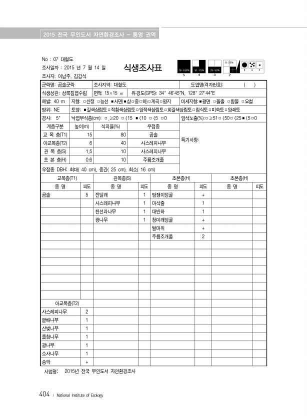 2015 전국 무인도서 자연환경조사 통영 권역 404 ? National Institute of Ecology No 07 대혈도 조사일자 2015 년 7 월 14 일 조사자이남주, 김갑식 식생조사표 군락명곰솔군락 조사지역대혈도 도엽명 격자번호 식생상관상록침엽수림 면적15×15 ㎡ 위?경도 GPS 34°4645N, 128°2744E 해발40 m 지형□산정 □능선 ■사면 ■상□중□하 □계곡□평지 미세지형■평면 □돌출 □함몰 □요철 방위NE 토양■갈색삼림토□적황색삼림토□암적색삼림토□회갈색삼림토□침식토□미숙토□암쇄토 경사5° 낙엽부식층 cm □.≥20 □ 15 ■ 10 □ 5 □0 암석노출 % □≥51□ 50□ 25■ 5□0 계층구분 높이 m 식피율 % 우점종 특기사항교 목 층 T1 15 80 곰솔 아교목층 T2 ...