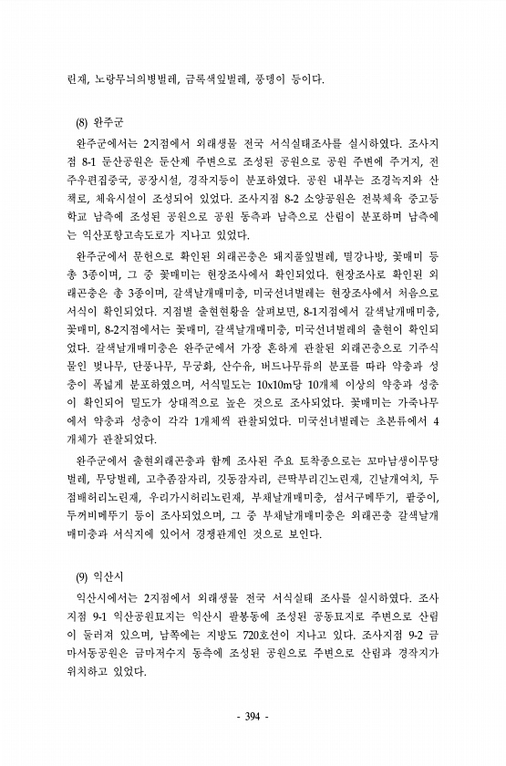 394 린재, 노랑무늬의병벌레, 금록색잎벌레, 풍뎅이 등이다. 8 완주군 완주군에서는 2지점에서 외래생물 전국 서식실태조사를 실시하였다. 조사지 점 8-1 둔산공원은 둔산제 주변으로 조성된 공원으로 공원 주변에 주거지, 전 주우편집중국, 공장시설, 경작지등이 분포하였다. 공원 내부는 조경녹지와 산 책로, 체육시설이 조성되어 있었다. 조사지점 8-2 소양공원은 전북체육 중고등 학교 남측에 조성된 공원으로 공원 동측과 남측으로 산림이 분포하며 남측에 는 익산포항고속도로가 지나고 있었다. 완주군에서 문헌으로 확인된 외래곤충은 돼지풀잎벌레, 멸강나방, 꽃매미 등 총 3종이며, 그 중 꽃매미는 현장조사에서 확인되었다. 현장조사로 확인된 외 래곤충은 총 3종이며, 갈색날개매미충, 미국선녀벌레는 현장조사에서 처음으로 서...