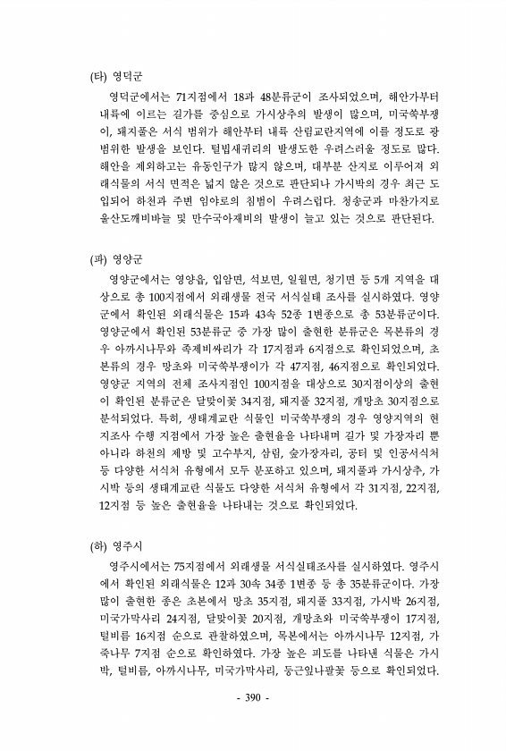 타 영덕군 영덕군에서는 71지점에서 18과 48분류군이 조사되었으며, 해안가부터 내륙에 이르는 길가를 중심으로 가시상추의 발생이 많으며, 미국쑥부쟁 이, 돼지풀은 서식 범위가 해안부터 내륙 산림교란지역에 이를 정도로 광 범위한 발생을 보인다. 털빕새귀리의 발생도한 우려스러울 정도로 많다. 해안을 제외하고는 유동인구가 많지 않으며, 대부분 산지로 이루어져 외 래식물의 서식 면적은 넓지 않은 것으로 판단되나 가시박의 경우 최근 도 입되어 하천과 주변 임야로의 침범이 우려스럽다. 청송군과 마찬가지로 울산도깨비바늘 및 만수국아재비의 발생이 늘고 있는 것으로 판단된다. 파 영양군 영양군에서는 영양읍, 입암면, 석보면, 일월면, 청기면 등 5개 지역을 대 상으로 총 100지점에서 외래생물 전국 서식실태 조사를 실시하였...