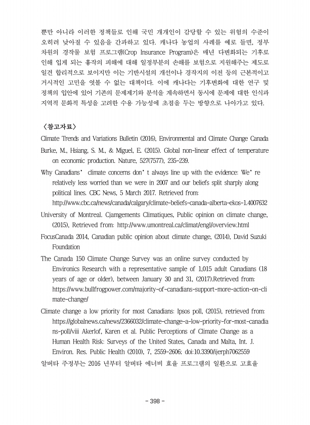 뿐만 아니라 이러한 정책들로 인해 국민 개개인이 감당할 수 있는 위험의 수준이 오히려 낮아질 수 있음을 간과하고 있다. 캐나다 농업의 사례를 예로 들면, 정부 차원의 경작물 보험 프로그램 Crop Insurance Program 은 매년 다변화되는 기후로 인해 입게 되는 흉작의 피해에 대해 일정부분의 손해를 보험으로 지원해주는 제도로 일견 합리적으로 보이지만 이는 기반시설의 개선이나 경작지의 이전 등의 근본적이고 거시적인 고민을 엿볼 수 없는 대책이다. 이에 캐나다는 기후변화에 대한 연구 및 정책의 입안에 있어 기존의 문제제기와 분석을 계속하면서 동시에 문제에 대한 인식과 지역적 문화적 특성을 고려한 수용 가능성에 초점을 두는 방향으로 나아가고 있다. 〈참고자료〉 Climate Trends and Varia...