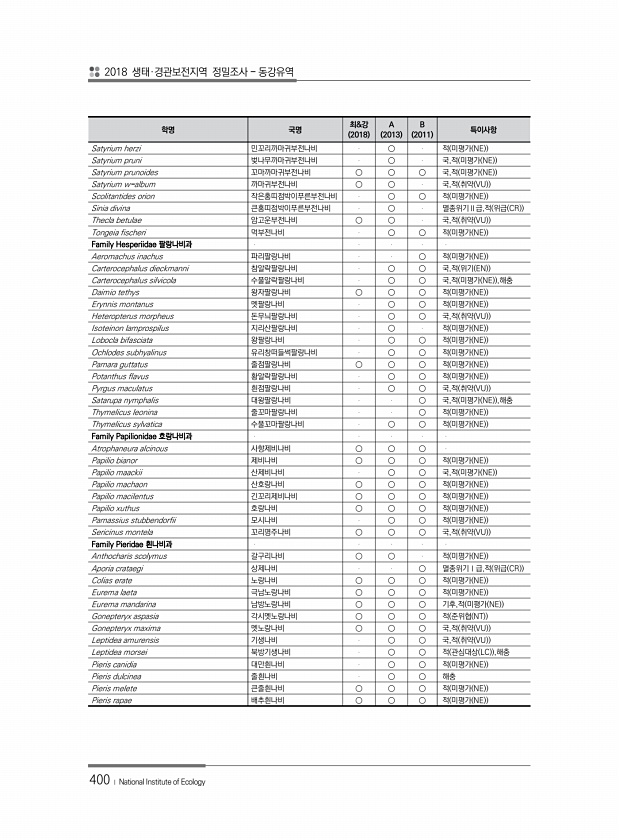 2018 생태·경관보전지역 정밀조사 동강유역 400 ? National Institute of Ecology 학명 국명 최&강 2018 A 2013 B 2011 특이사항 Satyrium herzi 민꼬리까마귀부전나비 ○ 적 미평가 NE Satyrium pruni 벚나무까마귀부전나비 ○ 국,적 미평가 NE Satyrium prunoides 꼬마까마귀부전나비 ○ ○ ○ 국,적 미평가 NE Satyrium w-album 까마귀부전나비 ○ ○ 국,적 취약 VU Scolitantides orion 작은홍띠점박이푸른부전나비 ○ ○ 적 미평가 NE Sinia divina 큰홍띠점박이푸른부전나비 ○ 멸종위기Ⅱ급,적 위급 CR Thecla betulae 암고운부전나비 ○ ○ 국,적 취약 VU...