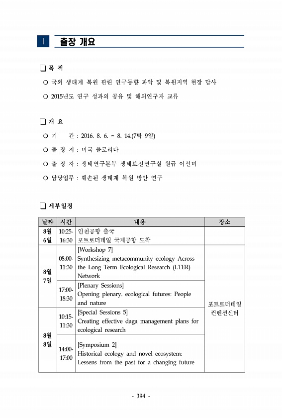 날짜 시간 내용 장소 8월 6일 1025- 1630 인천공항 출국 포트로더데일 국제공항 도착 8월 7일 0800- 1130 [Workshop 7] Synthesizing metacommunity ecology Across the Long Term Ecological Research LTER Network 포트로더데일 컨벤션센터 1700- 1830 [Plenary Sessions] Opening plenary. ecological futuresPeople and nature 8월 8일 1015- 1130 [Special Sessions 5] Creating effective daga management plans for ecological research 1400- 1700 [Symposium 2] Histo...