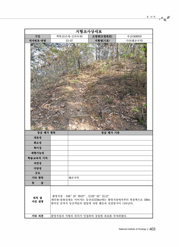 Ⅲ. 부 록 National Institute of EcologyⅠ403 지형조사상세표 구간 백학산 큰재-신의터재 도엽명 도엽번호 옥산 368093 격자번호-연번 E5-07 지형명 기호 기타 훼손지역 등급 평가 항목 등급 평가 기준 대표성 희소성 특이성 재현가능성 학술?교육적 가치 자연성 다양성 규모 기타 항목 훼손지역 등 급 위치 및 사진 설명 촬영지점 N36° 19′ 09.07″ , E128° 02′ 53.12″ 개터재-윗왕실재로 이어지는 등산로 570m 에는 촬영지점에서부터 북동쪽으로 500m 떨어진 곳까지 등산객들의 답압에 의한 훼손과 토양침식이 나타난다. 기타 의견 촬영지점과 지형의 위치가 인접하여 동일한 좌표를부여하였다.