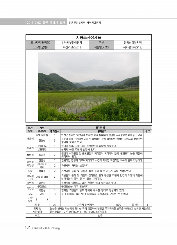 2017 DMZ 일원 생태계 조사 민통선이북지역 서부평야권역 404 ? National Institute of Ecology 지형조사상세표 조사지역 권역명 17-서부평야권역 구분 민통선이북지역 코스명 연번 덕산리코스 01 지형명 기호 곡저평야 GS12 평가 항목 세부 평가항목 평가방법 평가점수 평가근거 비 고 대표성 지역 대표성 1 연천군 신서면 덕산리에 위치한 곡의 상류부에 발달한 곡저평야로 대표성은 낮다. 전형성 3 유수에 의해 산지에서 공급된 퇴적물이 곡에 퇴적되어 형성된 지형으로 전형적인 형태를 보이고 있다. 희소성 분포빈도 1 국내의 대소 곡을 따라 곡저평야의 발달이 탁월하다. 분포패턴 1 산지의 하천 주변에 발달해 있다. 특이성 특이성 2 원생대 석영편암 및 운모편암의 퇴적물이 퇴적되어 있어, 편...
