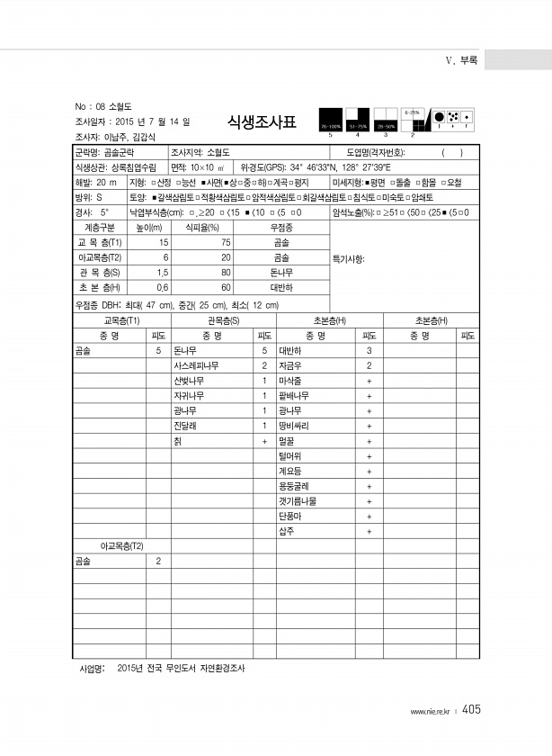 Ⅴ. 부록 www.nie.re.kr ? 405 No 08 소혈도 조사일자 2015 년 7 월 14 일 조사자이남주, 김갑식 식생조사표 군락명곰솔군락 조사지역소혈도 도엽명 격자번호 식생상관상록침엽수림 면적10×10 ㎡ 위?경도 GPS 34°4633N, 128°2739E 해발20 m 지형□산정 □능선 ■사면 ■상□중□하 □계곡□평지 미세지형■평면 □돌출 □함몰 □요철 방위S 토양■갈색삼림토□적황색삼림토□암적색삼림토□회갈색삼림토□침식토□미숙토□암쇄토 경사5° 낙엽부식층 cm □.≥20 □ 15 ■ 10 □ 5 □0 암석노출 % □≥51□ 50□ 25■ 5□0 계층구분 높이 m 식피율 % 우점종 특기사항교 목 층 T1 15 75 곰솔 아교목층 T2 6 20 곰솔 관 목 층 S 1.5 80 돈나무 초 본 층 H 0....