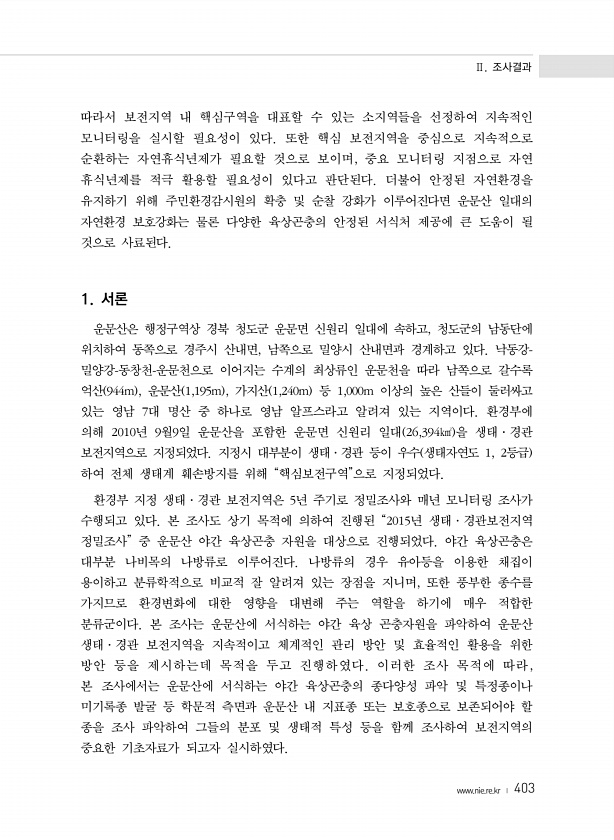 Ⅱ. 조사결과 www.nie.re.kr ? 403 따라서 보전지역 내 핵심구역을 대표할 수 있는 소지역들을 선정하여 지속적인 모니터링을 실시할 필요성이 있다. 또한 핵심 보전지역을 중심으로 지속적으로 순환하는 자연휴식년제가 필요할 것으로 보이며, 중요 모니터링 지점으로 자연 휴식년제를 적극 활용할 필요성이 있다고 판단된다. 더불어 안정된 자연환경을 유지하기 위해 주민환경감시원의 확충 및 순찰 강화가 이루어진다면 운문산 일대의 자연환경 보호강화는 물론 다양한 육상곤충의 안정된 서식처 제공에 큰 도움이 될 것으로 사료된다. 1. 서론 운문산은 행정구역상 경북 청도군 운문면 신원리 일대에 속하고, 청도군의 남동단에 위치하여 동쪽으로 경주시 산내면, 남쪽으로 밀양시 산내면과 경계하고 있다. 낙동강- 밀양강-동창천-...