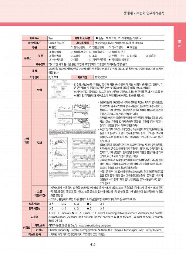 411 생태계 기후변화 연구사례분석 기 타 사례 No. 324 사례 자료 유형 ■ 논문 □ 보고서 □ 기타 학술/기사자료 대상지 국가 United States 대상지 지역 Mississippi river, Northern Gulf of Mexico 부문 ■ 통합 □ 취약성평가 □ 영향성평가 □ 리스크평가 ■ 모델링 분류군 부문 □ 육상식물 □ 식물 침엽수 □ 식물 활엽수 □ 식물 초 본 □ 육상동물 □ 포유류 □ 조류 □ 곤충 류 □ 양서류 □ 파충류 □ 수상동식물 □ 어류 □ 저서무척추류 ■ 기타 연안생태계 세부정보 멕시코만 사례 분석을 통한 해안가 부영양화에 기후변화가 미치는 영향 분석 목적 모델링을 통하여 기후요인의 변화에 따른 수문학적 변화가 인위적 영양소 및 용존산소 부영양화평가 에 미치는 영향 평...