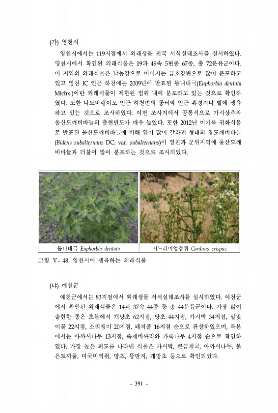 갸 영천시 영천시에서는 119지점에서 외래생물 전국 서식실태조사를 실시하였다. 영천시에서 확인된 외래식물은 19과 49속 5변종 67종, 총 72분류군이다. 이 지역의 외래식물은 낙동강으로 이어지는 금호강변으로 많이 분포하고 있고 영천 IC 인근 하천에는 2009년에 발표된 톱니대극 Euphorbia dentata Michx. 이란 외래식물이 제한된 범위 내에 분포하고 있는 것으로 확인하 였다. 또한 나도바랭이도 인근 하천변의 공터와 인근 휴경지나 밭에 생육 하고 있는 것으로 조사하였다. 이번 조사지에서 공통적으로 가시상추와 울산도깨비바늘의 출현빈도가 매우 높았다. 또한 2012년 미기록 귀화식물 로 발표된 울산도깨비바늘에 비해 잎이 많이 갈라진 형태의 왕도깨비바늘 Bidens subalternans DC....