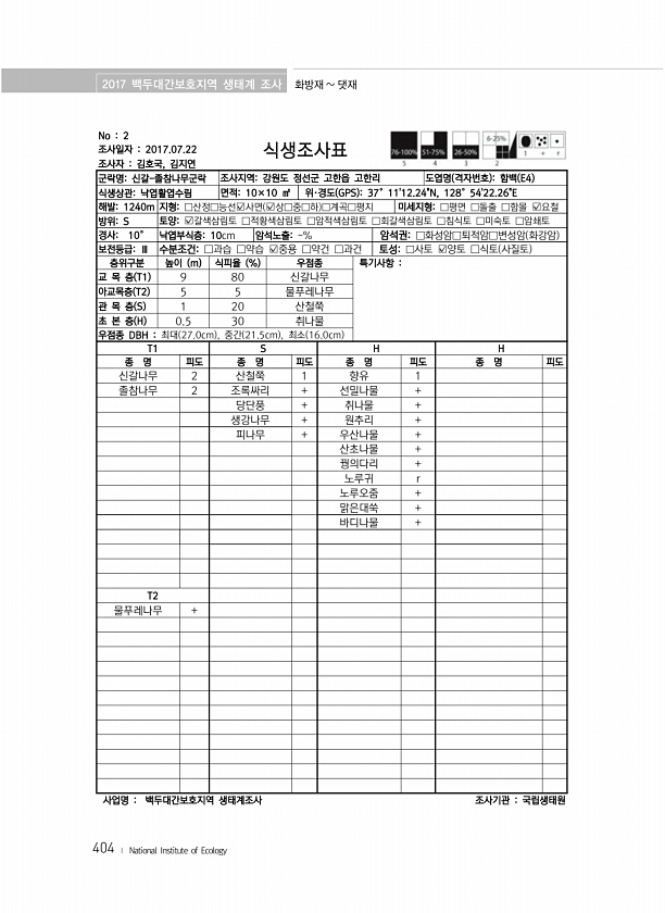2017 백두대간보호지역 생태계 조사 화방재 댓재 404 ? National Institute of Ecology No 2 조사일자 2017.07.22 조사자 김호국, 김지연 식생조사표 군락명신갈-졸참나무군락 조사지역강원도 정선군 고한읍 고한리 도엽명 격자번호 함백 E4 식생상관낙엽활엽수림 면적10×10 ㎡ 위·경도 GPS 37°1112.24N, 128°5422.26E 해발1240m 지형□산정□능선?사면 ?상□중□하 □계곡□평지 미세지형□평면 □돌출 □함몰 ?요철 방위S 토양?갈색삼림토 □적황색삼림토 □암적색삼림토 □회갈색삼림토 □침식토 □미숙토 □암쇄토 경사10° 낙엽부식층10cm 암석노출-% 암석권□화성암□퇴적암□변성암 화강암 보전등급Ⅲ 수분조건□과습 □약습 ?중용 □약건 □과건 토성□사토 ?양토 □식토...