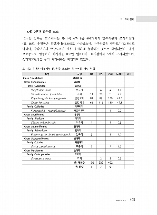 Ⅱ. 조사결과 www.nie.re.kr ? 405 가 2구간 감우골 코스 2구간 감우골 코스에서는 총 4목 6과 9종 402개체의 담수어류가 조사되었다 표 183 우점종은 참갈겨니 44.8% 로 나타났으며, 아우점종은 금강모치 42.3% 로 나타나, 참갈겨니와 금강모치가 매우 우세하게 출현하는 것으로 확인되었다. 법정 보호종으로 멸종위기 야생생물 II급인 열목어가 D4지점에서 5개체 조사되었으며, 생태계교란생물 등의 외래어류는 확인되지 않았다. 표 183. 민통선이북지역 감우골 코스 의 담수어류 서식 현황 학명 국명 D4 D5 전체 우점도 비고 Class Osteichthyes 경골어 강 Order Cypriniformes 잉어목 Family Cyprinidae 잉어과 Pungtungia herzi 돌고기 ...