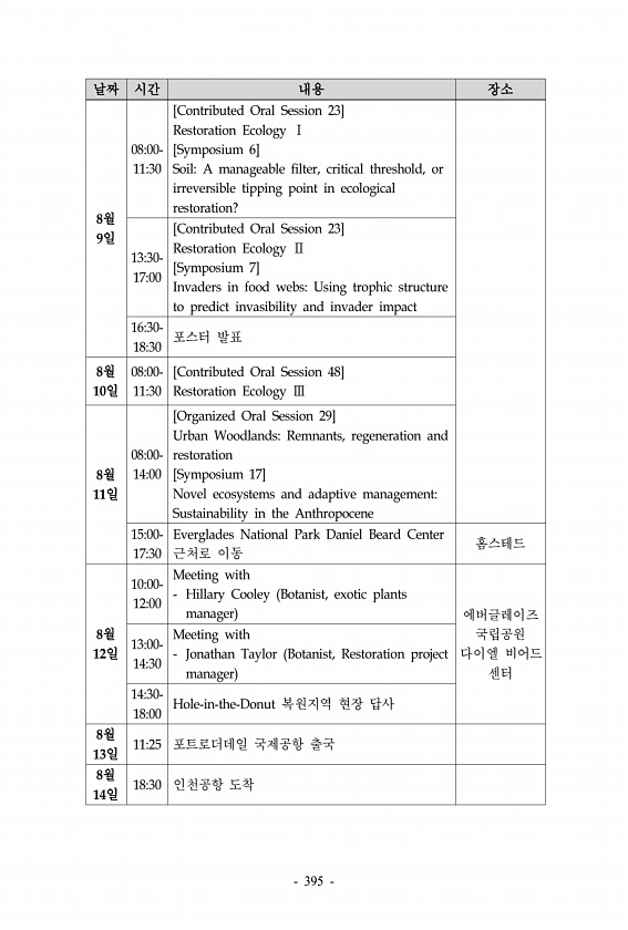 날짜 시간 내용 장소 8월 9일 0800- 1130 [Contributed Oral Session 23] Restoration Ecology Ⅰ [Symposium 6] SoilA manageable filter, critical threshold, or irreversible tipping point in ecological restoration? 1330- 1700 [Contributed Oral Session 23] Restoration Ecology Ⅱ [Symposium 7] Invaders in food websUsing trophic structure to predict invasibility and invader impact 1630- 1830 포스터 발표 8월 10일 0800- 1130 [C...
