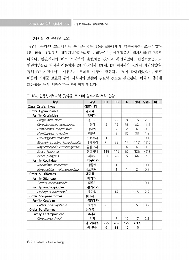 2016 DMZ 일원 생태계 조사 민통선이북지역 동부산악권역 406 ? National Institute of Ecology 나 4구간 두타연 코스 4구간 두타연 코스에서는 총 4목 6과 15종 689개체의 담수어류가 조사되었다 표 184 우점종은 참갈겨니 47.3% 로 나타났으며, 아우점종은 배가사리 17.0% 로 나타나, 참갈겨니가 매우 우세하게 출현하는 것으로 확인되었다. 법정보호종으로 천연기념물로 지정된 어름치가 D3 지점에서 3개체, D7 지점에서 30개체 확인되었다. 특히 D7 지점에서는 어름치가 무리를 이루어 활동하는 것이 확인되었으며, 향후 어름치 개체군 보호를 위해 서식지의 보존이 필요할 것으로 판단된다. 이외의 생태계 교란생물 등의 외래어류는 확인되지 않았다. 표 184. 민통선이북지역 감...