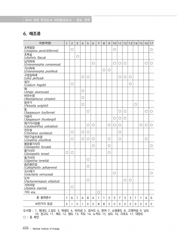 2015 전국 무인도서 자연환경조사 완도 권역 406 ? National Institute of Ecology 6. 해조류 국명 학명 1 2 3 4 5 6 7 8 9 10 11 12 13 14 15 16 17 초록털말 Urospora penicilliformis ○ ○ ○ 초록실 Ulothrix flacca ○ 납작파래 Enteromorpha compressa ○ ○ ○ ○ ○ ○ 가시파래 Enteromorpha prolifera ○ ○ 구멍갈파래 Ulva pertusa ○ ○ ○ ...