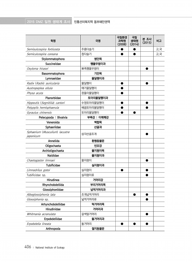 2015 DMZ 일원 생태계 조사 민통선이북지역 동부해안권역 406 ? National Institute of Ecology 학명 국명 국립환경 과학원 2008 국립 생태원 2014 본 조사 2015 비고 Semisulcospira forticosta 주름다슬기 ● ● 고,국 Semiculcospira coreana 참다슬기 ● ● 고,국 Stylommatophora 병안목 Succineidae 쨈물우렁이과 Oxyloma hirasei 뾰족쨈물우렁이 ● Basommatophora 기안목 Lymnaeidae 물달팽이과 Radix Radix auricularia 물달팽이 ● ● Austropeplea ollula 애기물달팽이 ● Physa acuta 왼돌이물달팽이 ● Planorbidae 또아리물달팽이과 Hip...